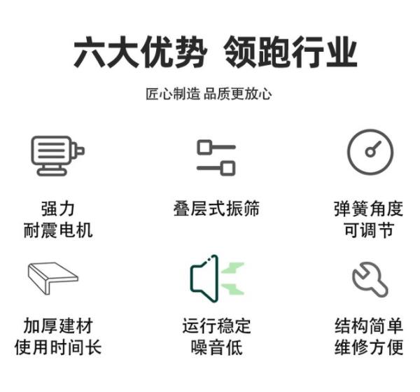 篩機(jī)篩面由不同傾角的多區(qū)段(一般為三段)組成,使篩分物料在各區(qū)段呈近似等厚分布,有利于物料在篩面上的輸送、分層和透篩。該系列篩機(jī)與其他直線(xiàn)篩相比具有更高的篩分效率和單位設(shè)備重量處理量大及篩面磨損小,不易堵孔等特點(diǎn)。