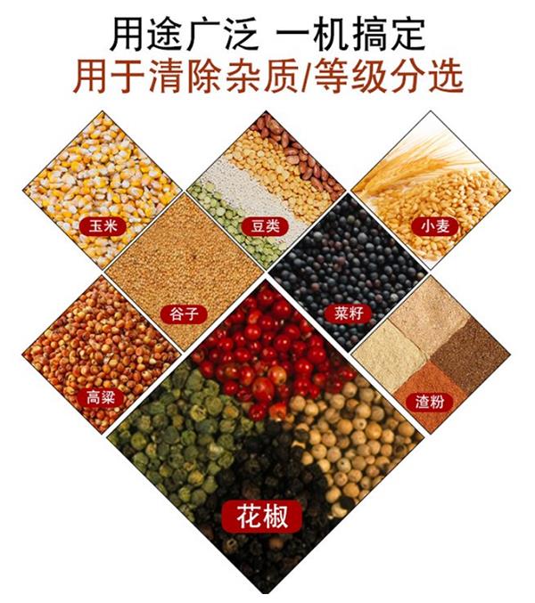 本機(jī)為二層篩網(wǎng),先經(jīng)過(guò)進(jìn)料口處風(fēng)機(jī)吹風(fēng),直接吹走重量輕的雜質(zhì)或糠殼廢秸稈.上層篩網(wǎng)的初次篩選把大雜清理過(guò),好的糧食(種子)直接落到下層篩網(wǎng)上,下層篩網(wǎng)會(huì)把糧食顆粒(種子)中的小雜.小石子.有缺陷的癟籽直接漏掉,完好的糧食(種子)會(huì)從出料口篩分凈選出來(lái)。整機(jī)采用離心軸的篩分原理,工作時(shí)物料上下?lián)u擺,通過(guò)風(fēng)選和震動(dòng)把好的物料精選出料.